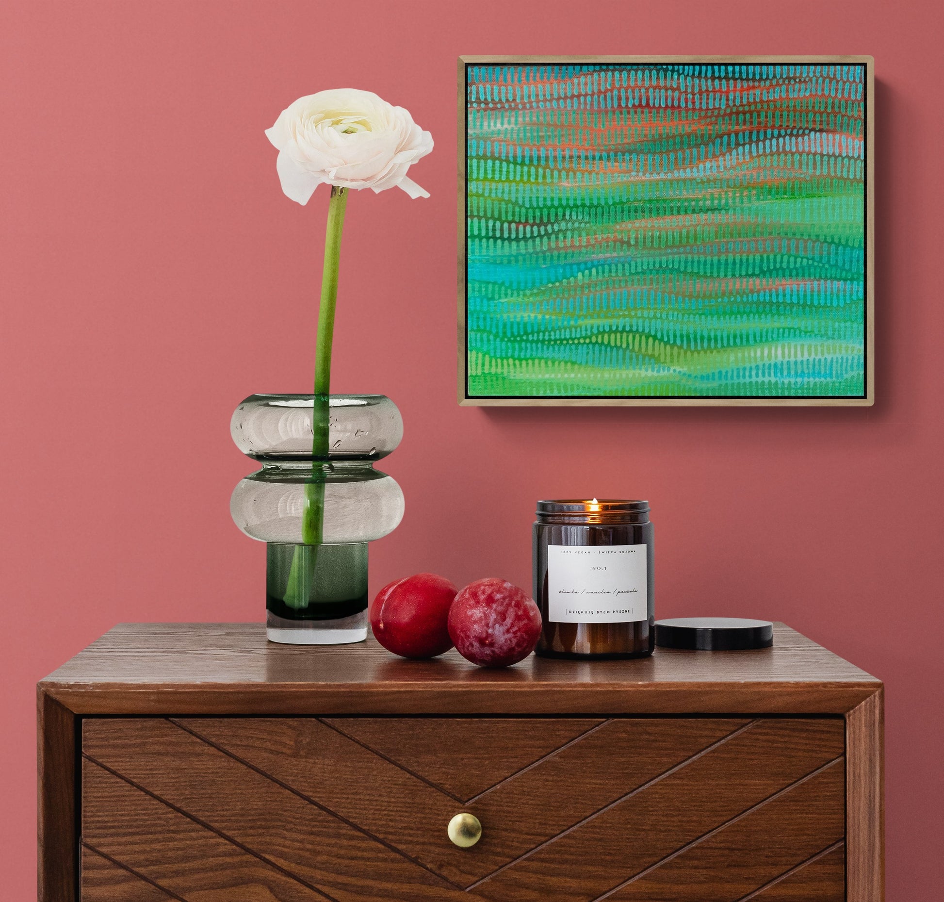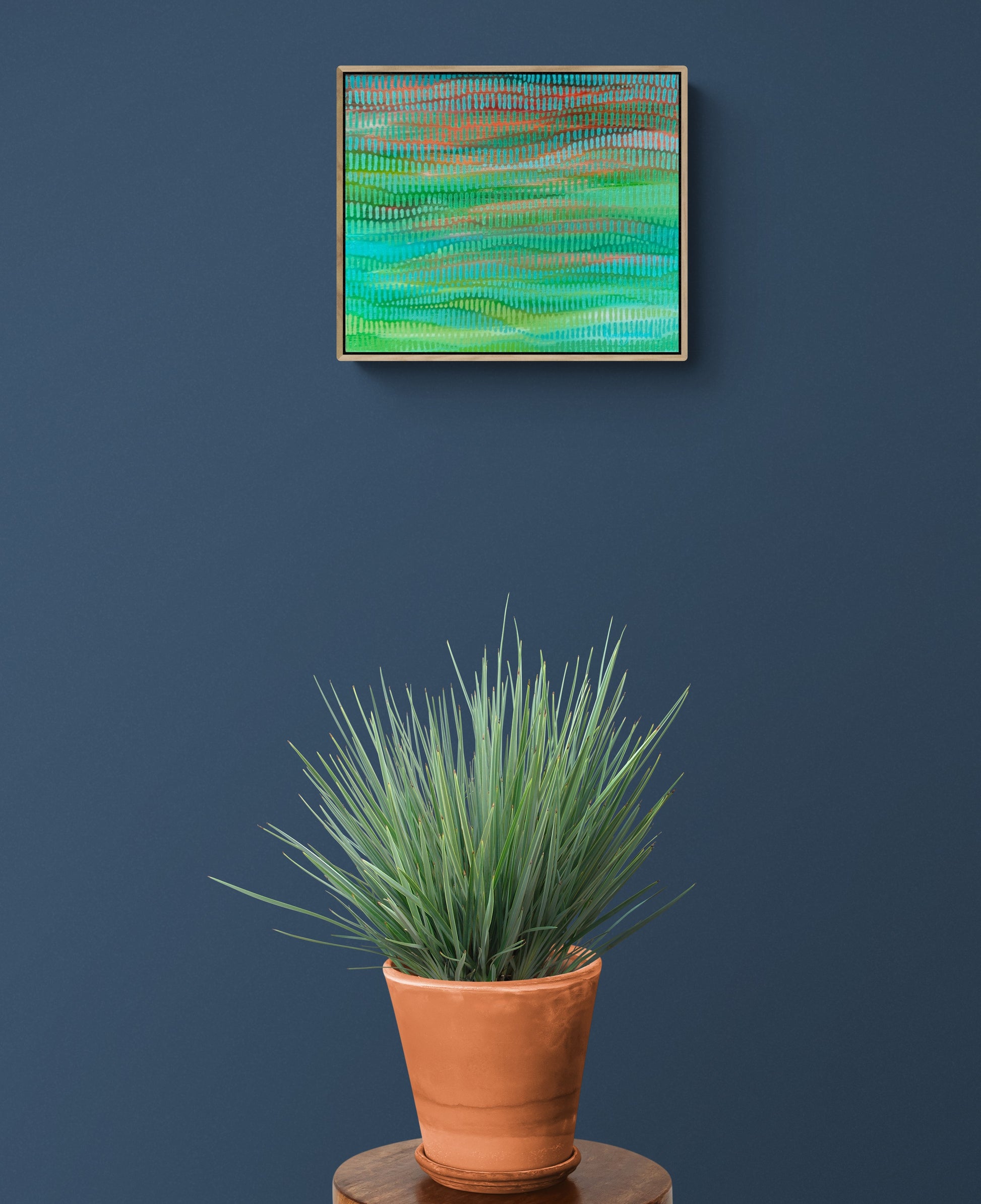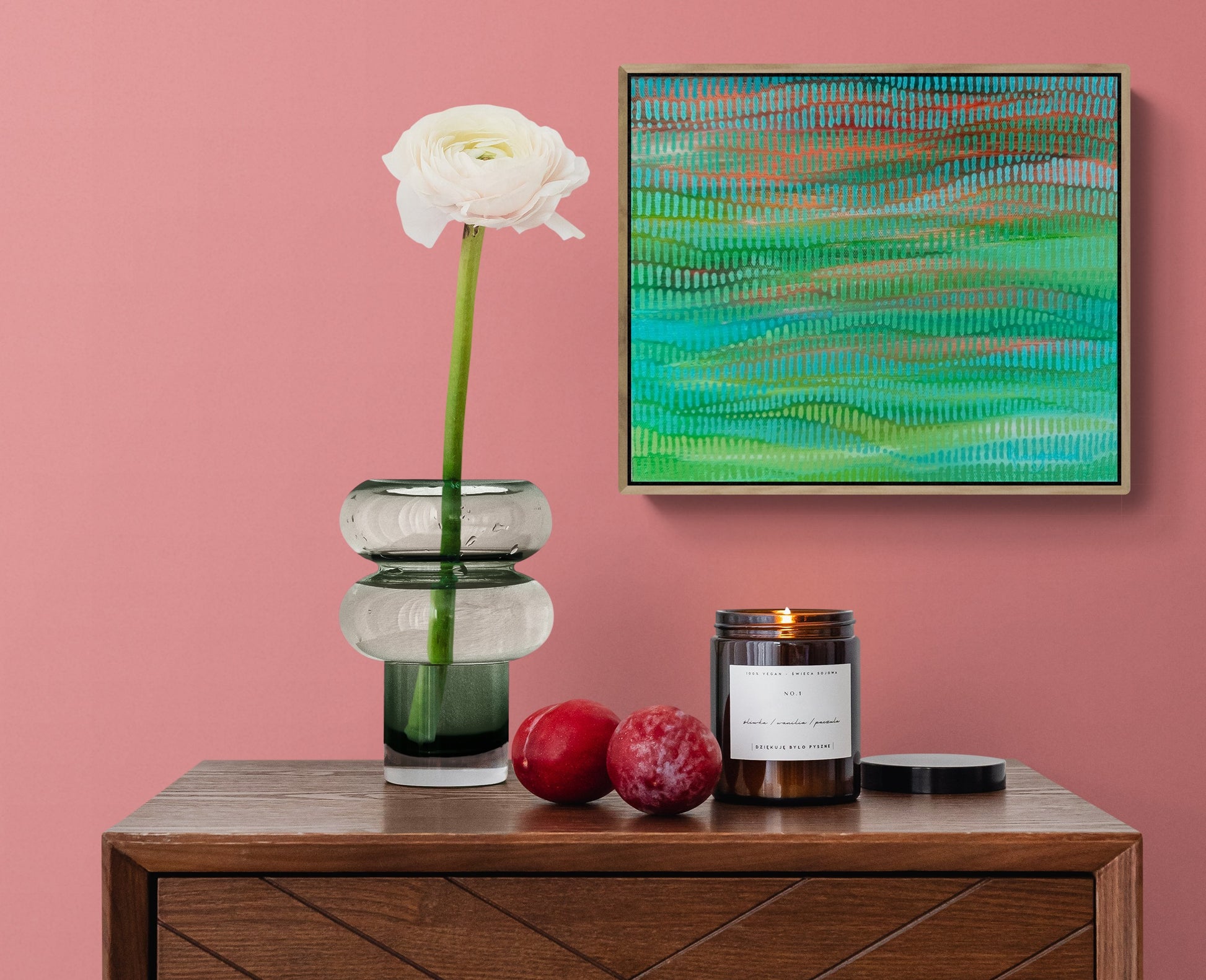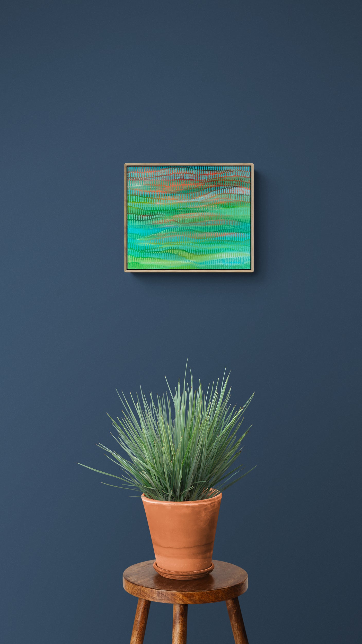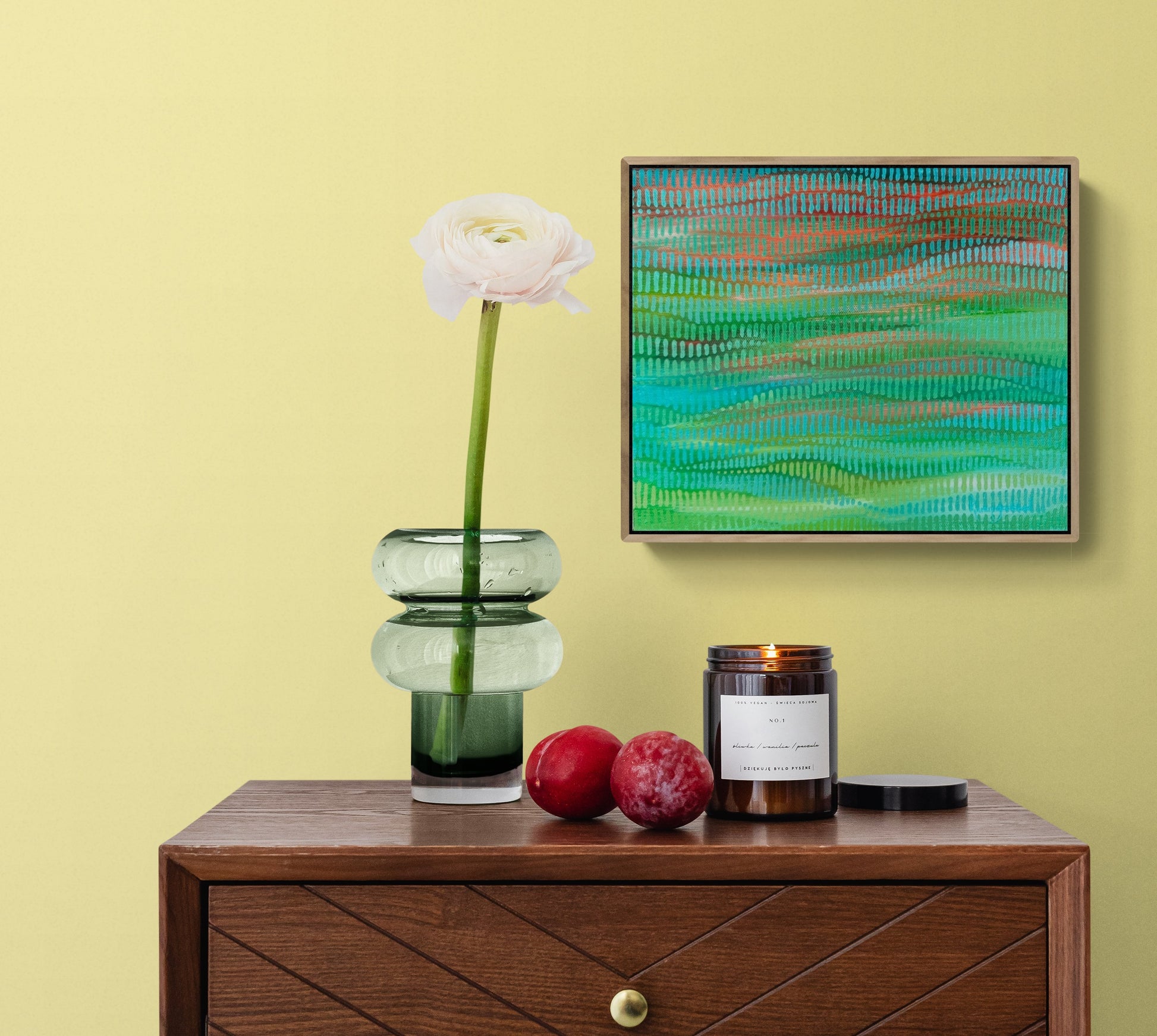 The story behind the original work - This work is inspired by my surroundings and nature, the modern fresh pallet is perfect if you want to add a little bit of nature to your space. It's certainly a joyful fresh work, using many layers and some wonderful transparent elements to the mark making. It has a sense of tranquillity.
