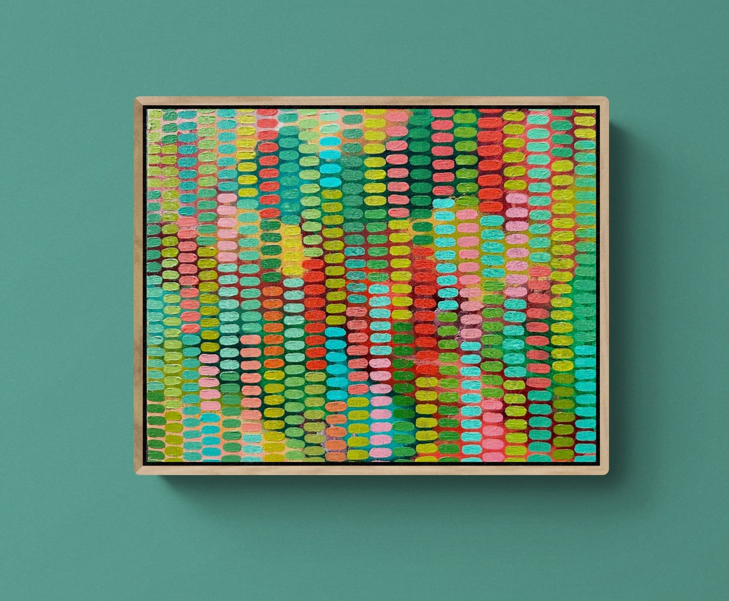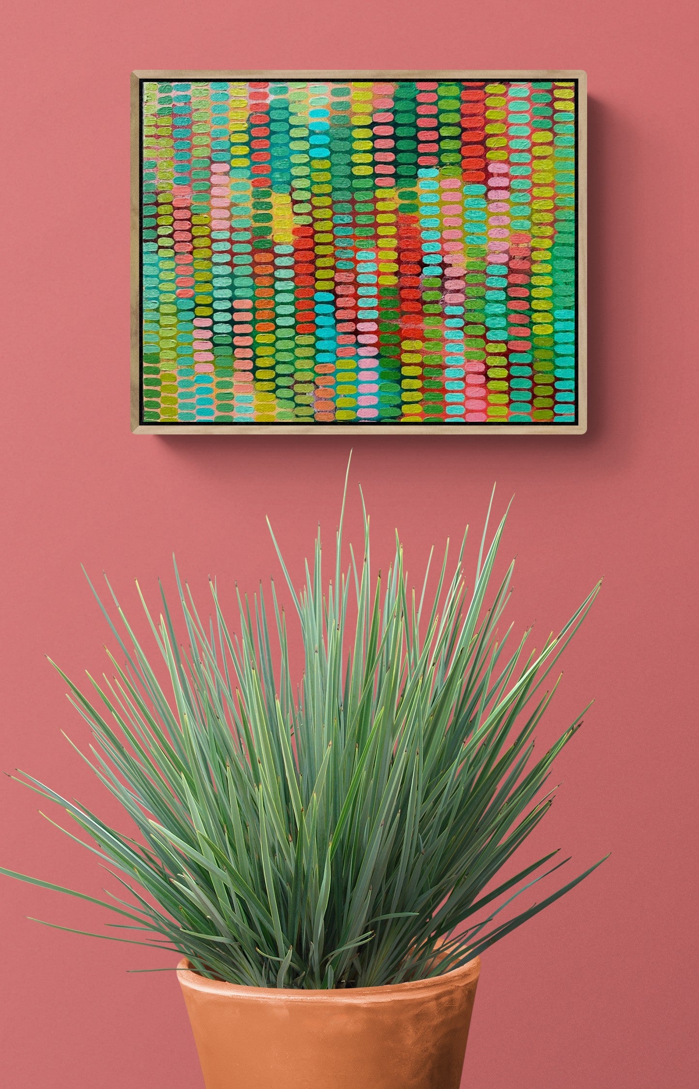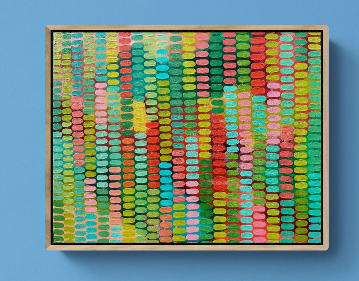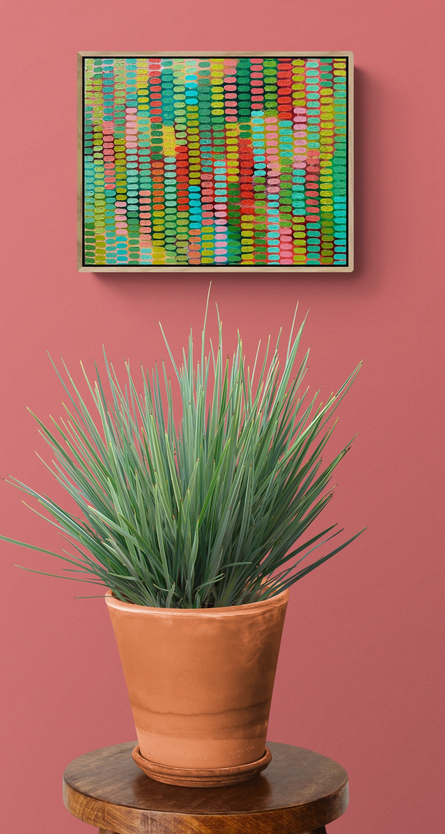 The story behind the original work - This work is inspired by my surroundings and nature, the modern fresh pallet is perfect if you want to add a little bit of nature to your space. It's certainly a joyful fresh work, using many layers and some wonderful transparent elements to the mark making. It has a sense of tranquillity.