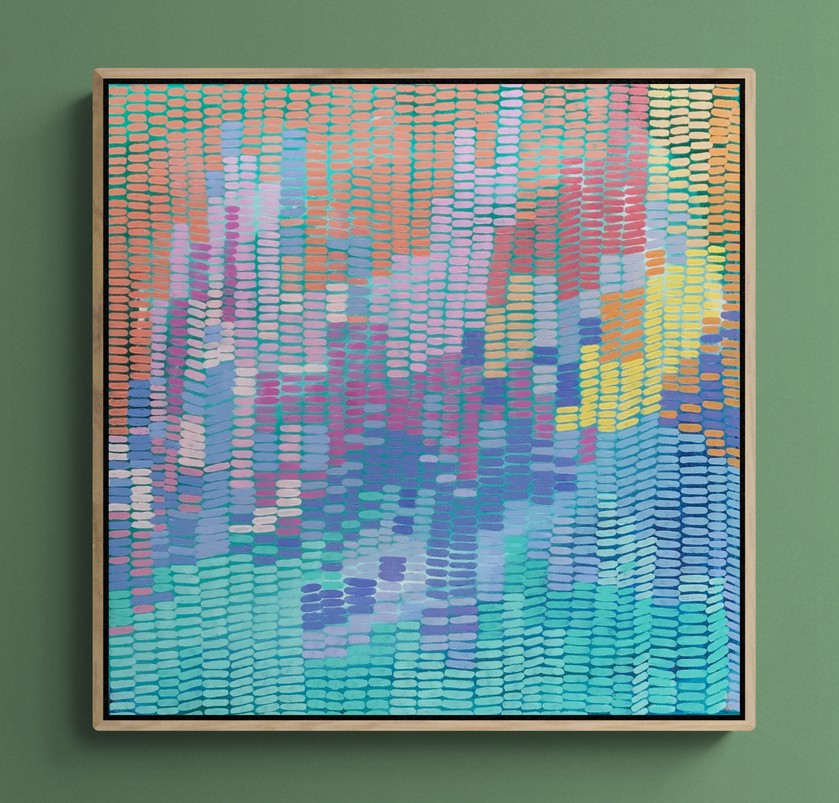This work features beautiful sunset tones of corals, blues, lilac, pink, ochre, tangerine.