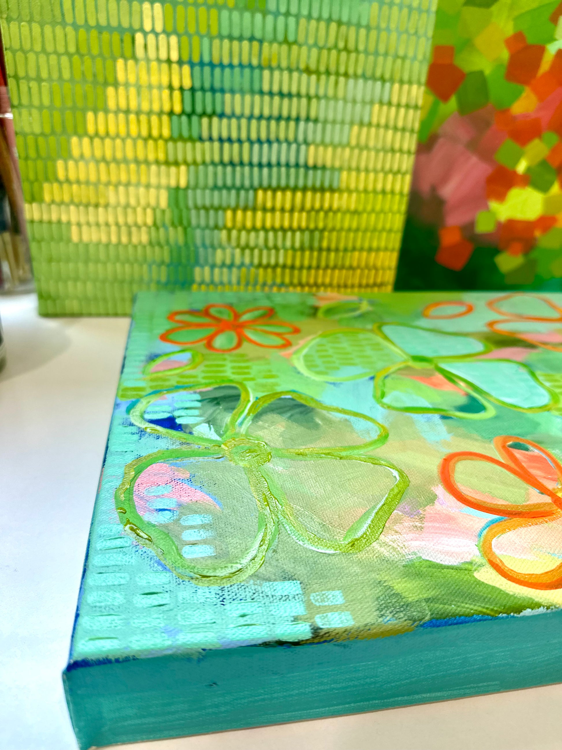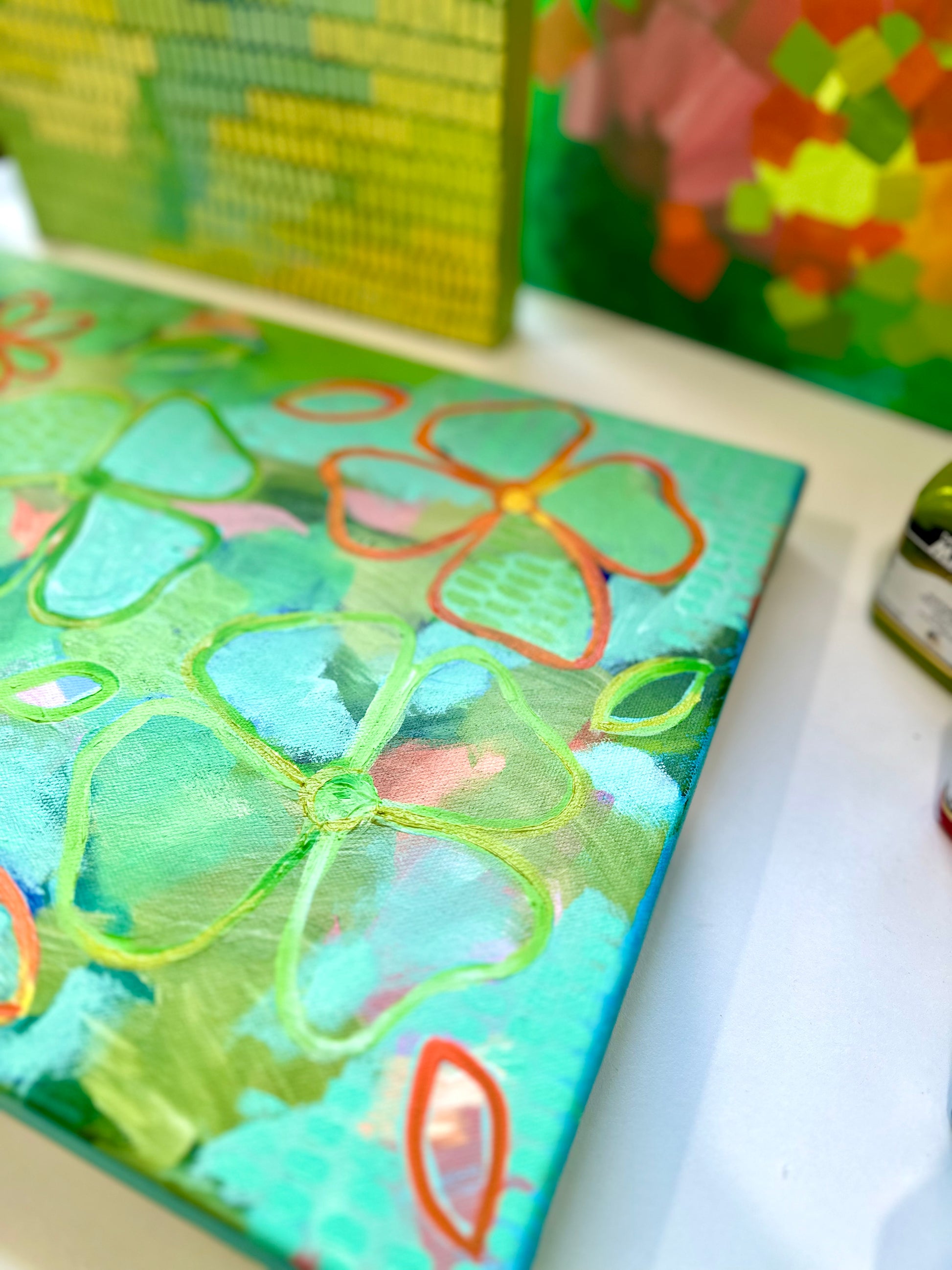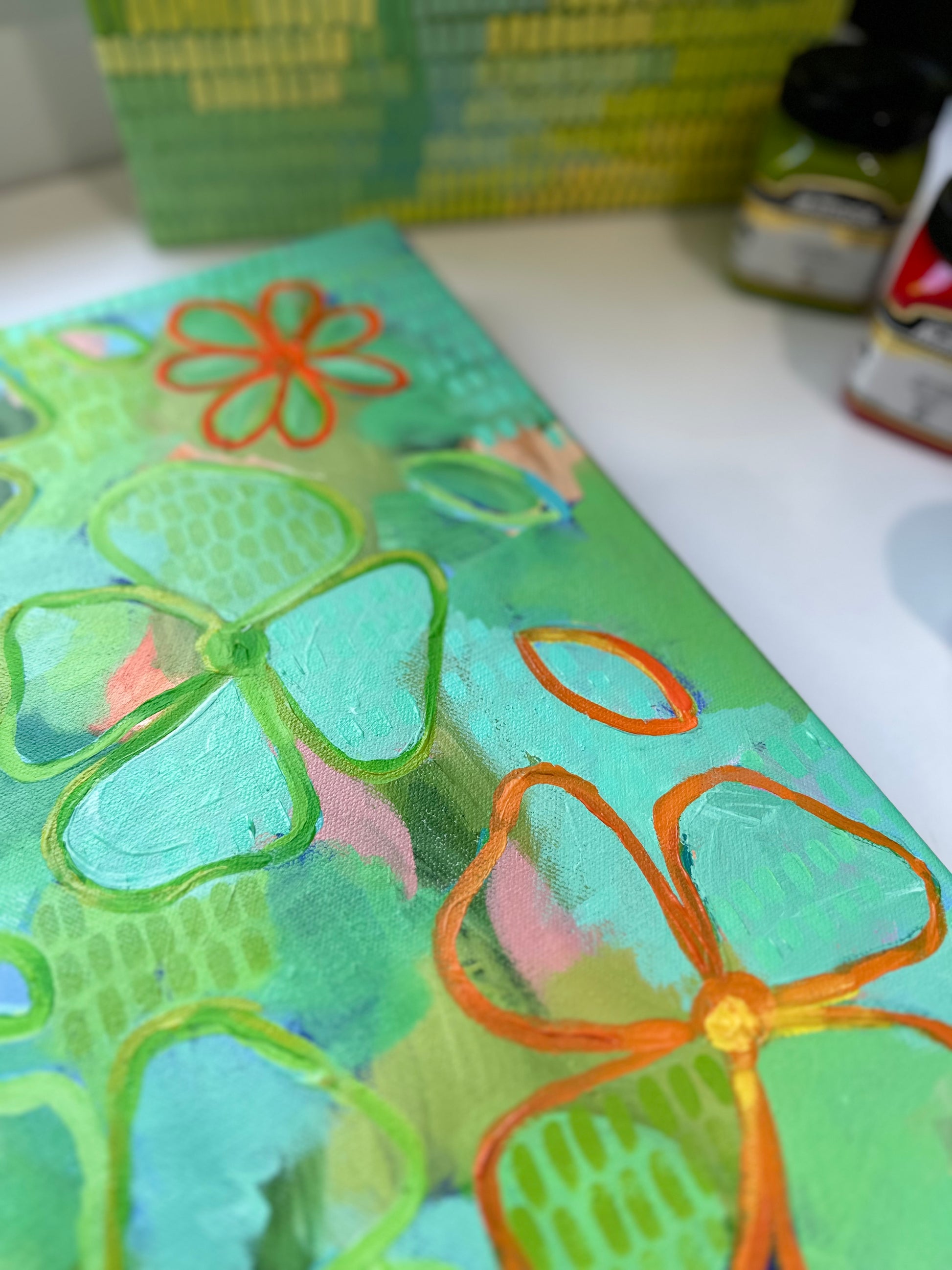 The story behind the original work - This work is inspired by my surroundings and nature, the warm tones in this work are rich, shown in the last image on this listing. This work is in acrylic, a vibrant piece of joy, fun elements such as floating flowers and textural paint and micro pointillism, in modern colours will add a bit of Sass to your collection.
