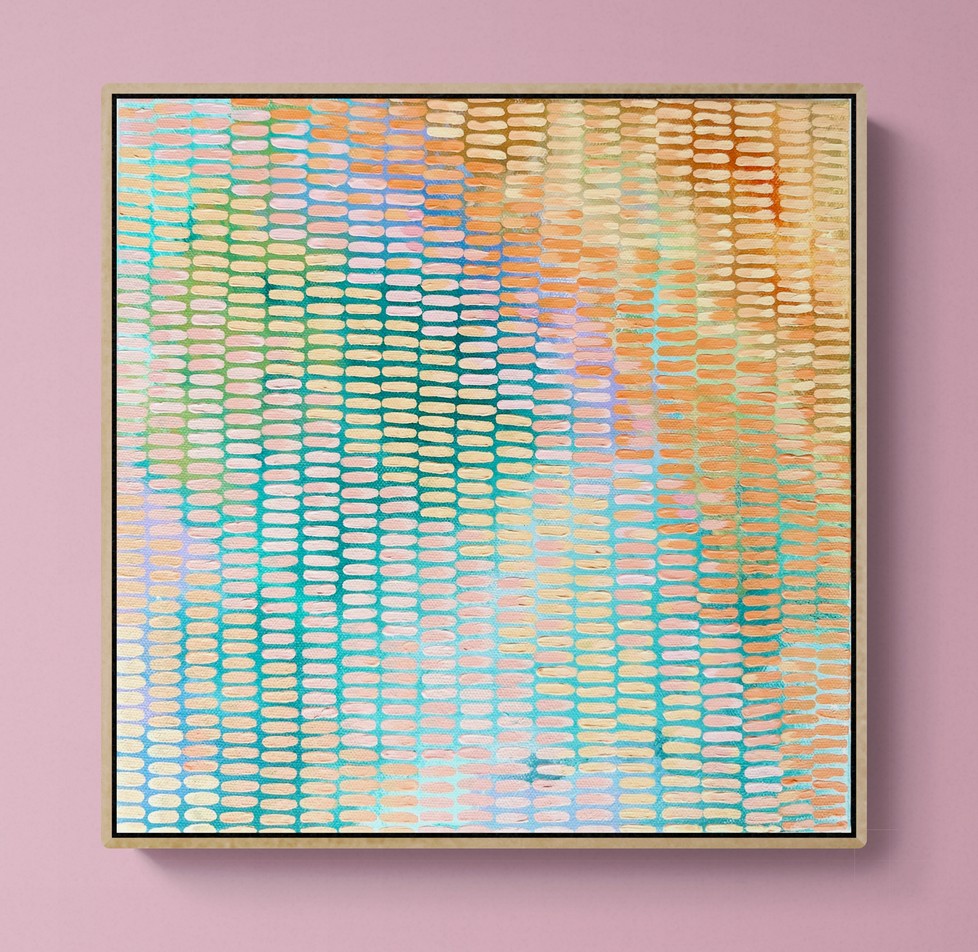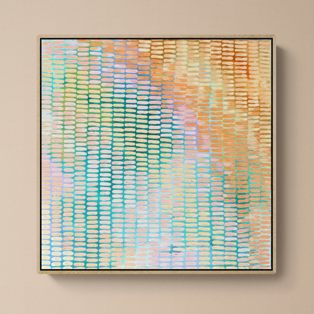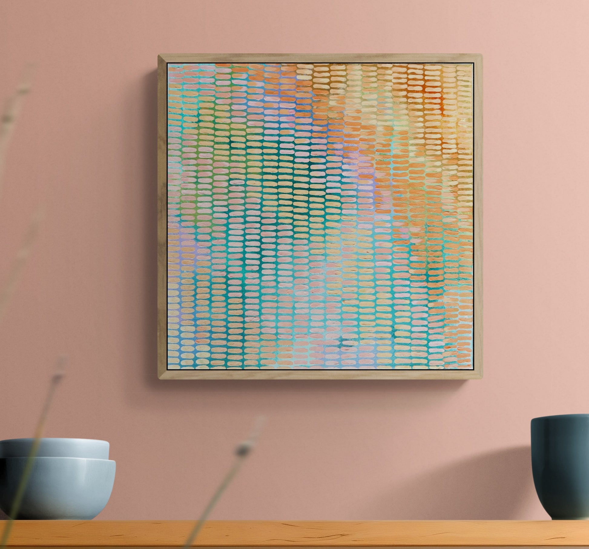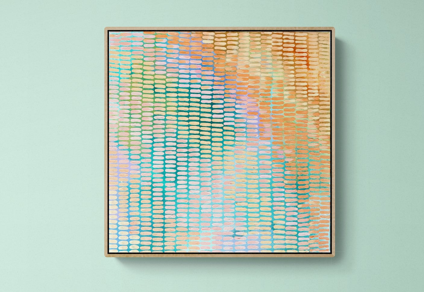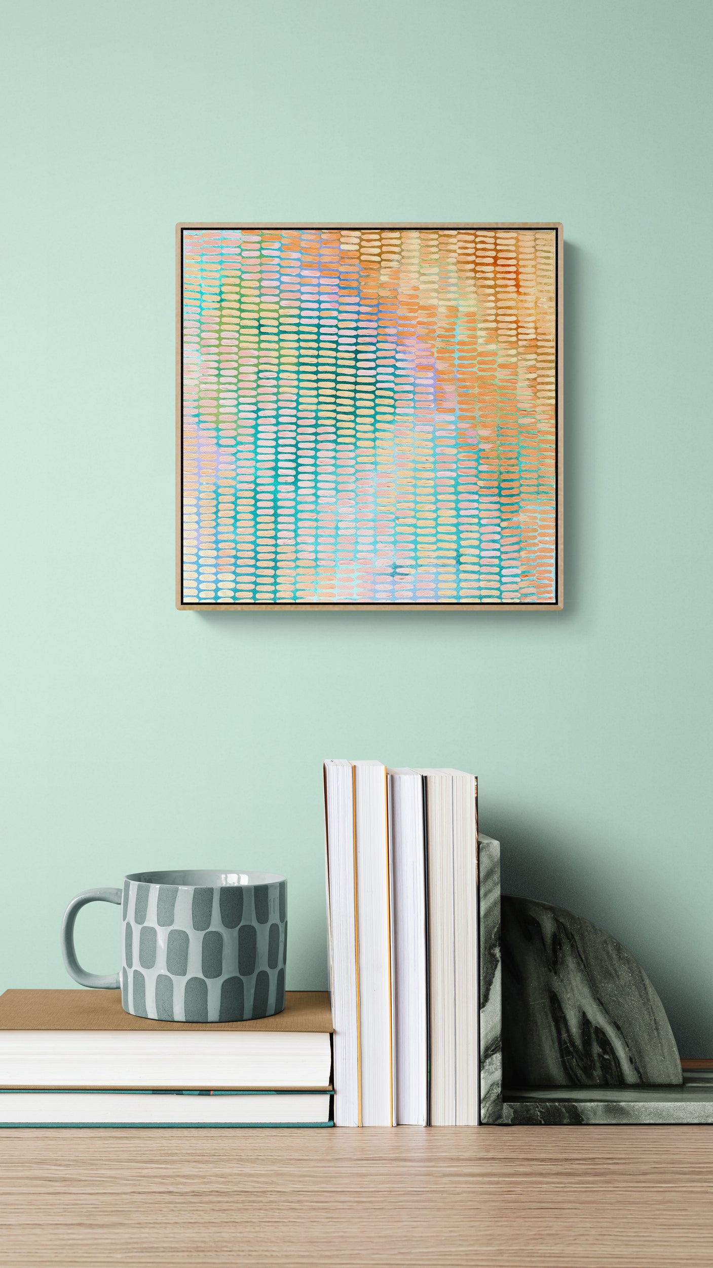 This is a lovely fresh modern textural work. Framed in Oak and ready to hang this work is 33cm x 33cm