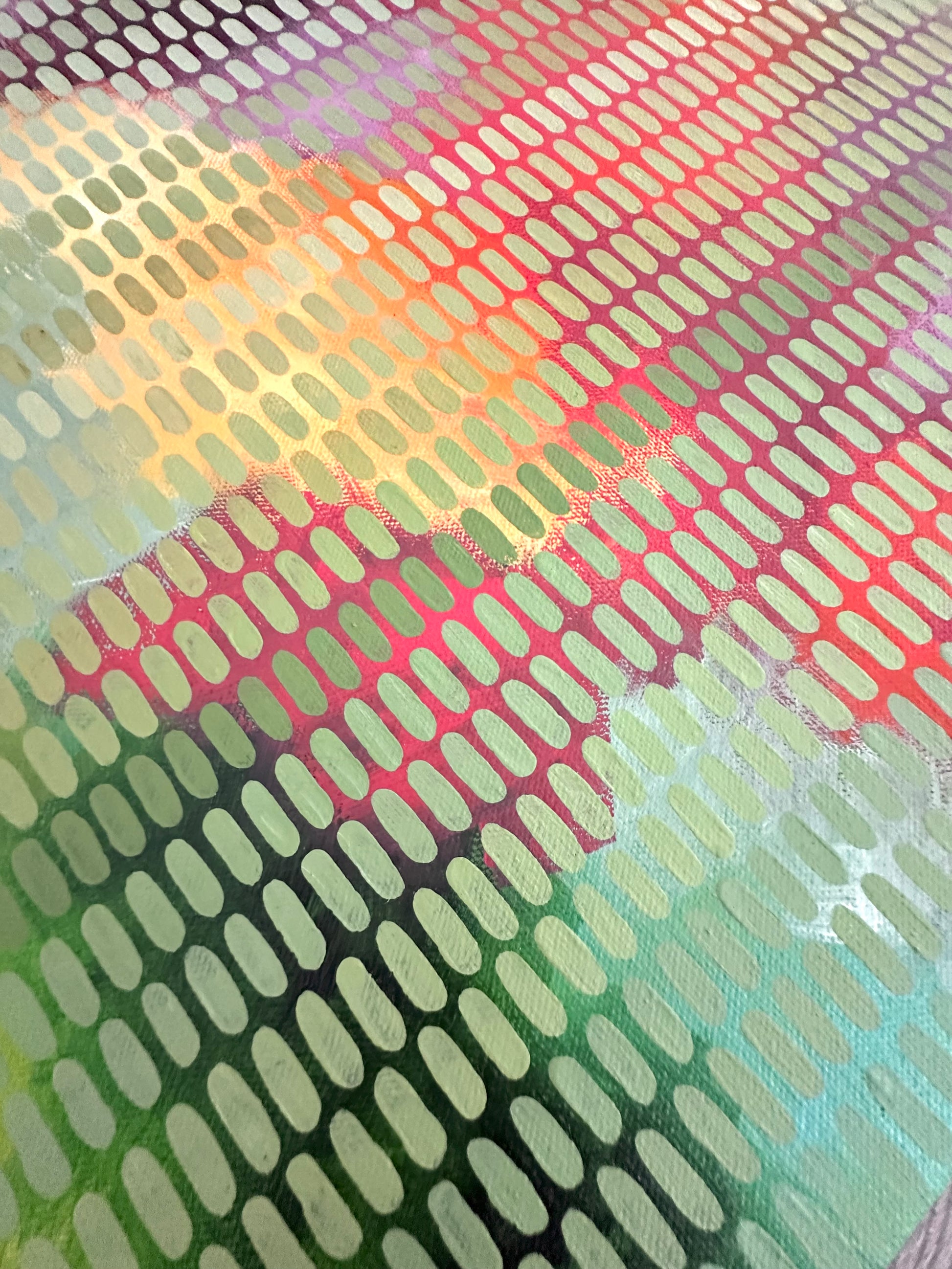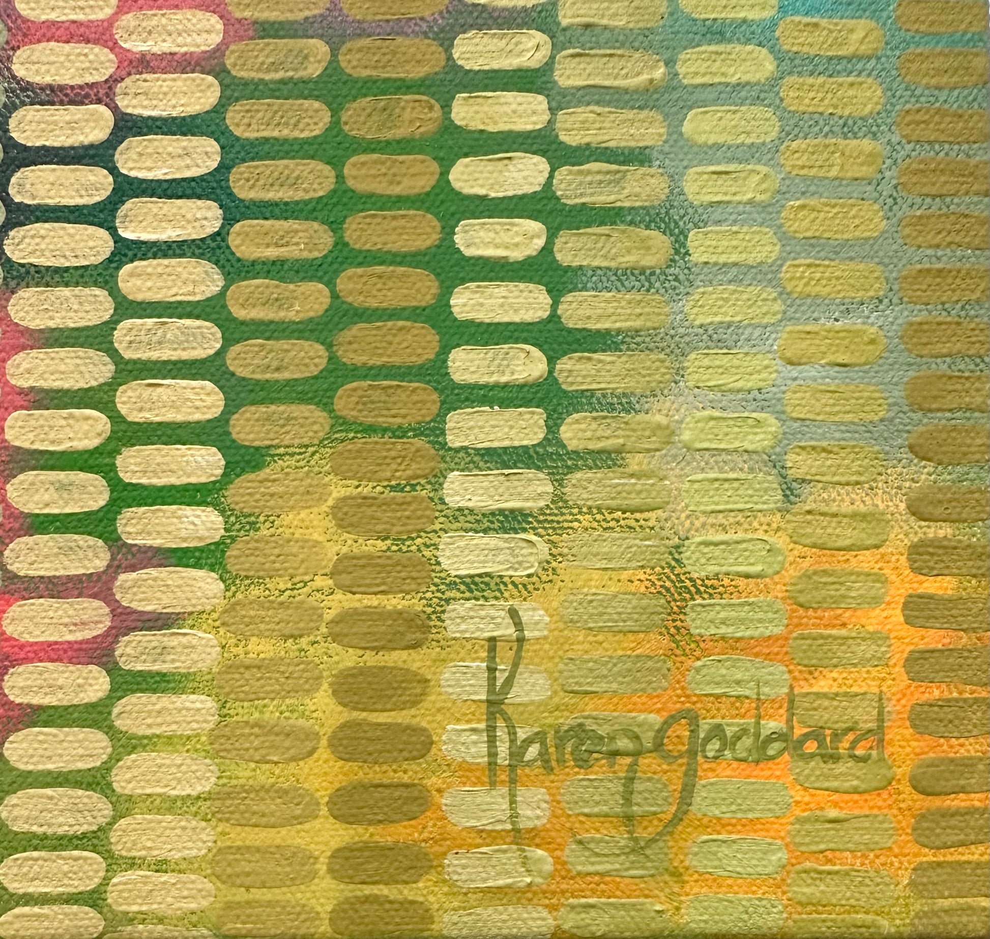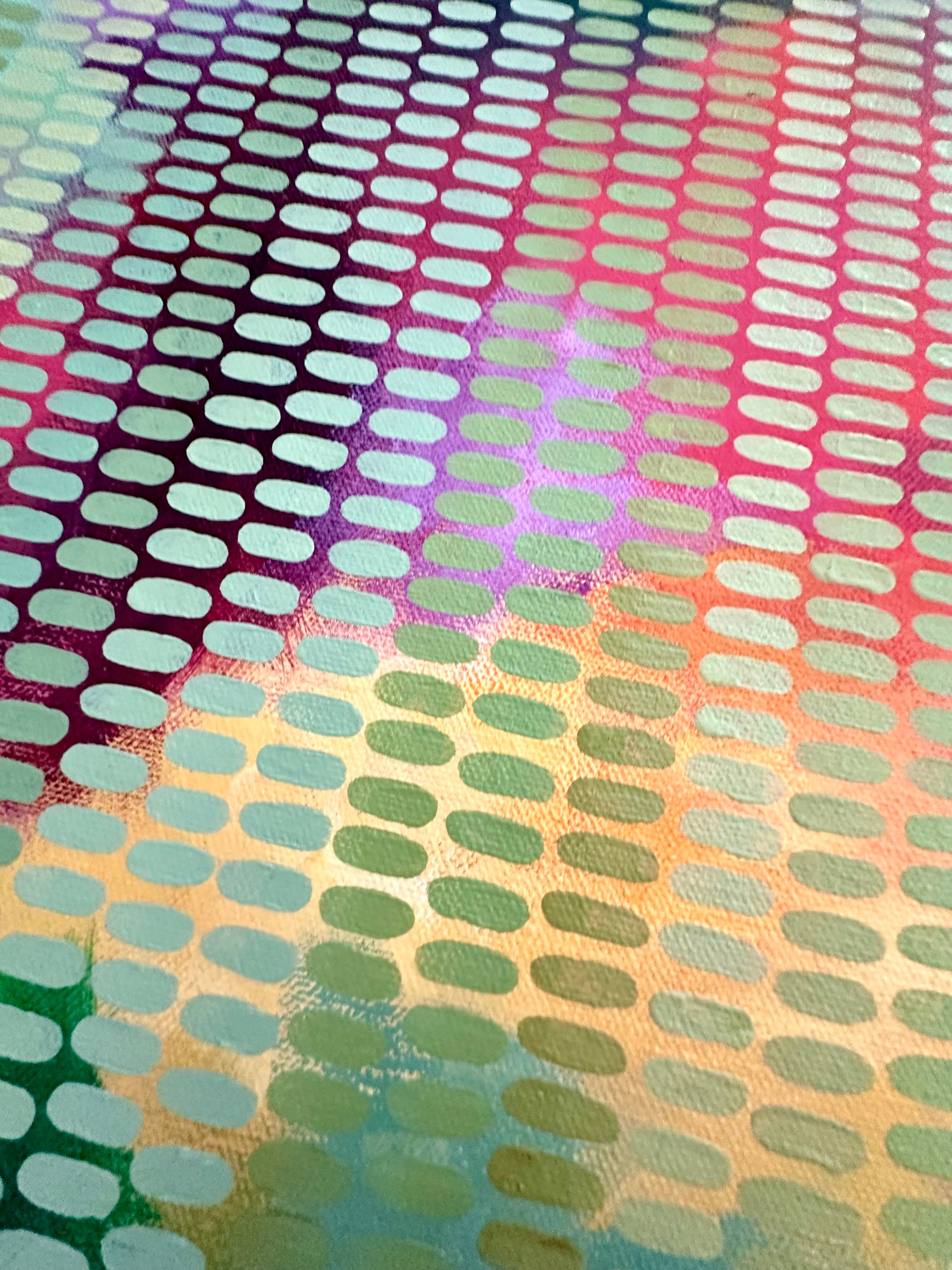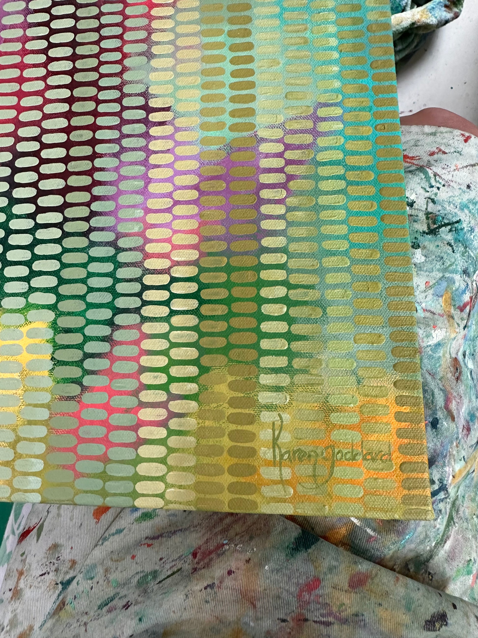 These brush strokes are usually purposefully unconnected, the space between has as much significance as the organic shaped brush strokes. These colourful works take time as each colour is carefully mixed, giving the work a unique element.