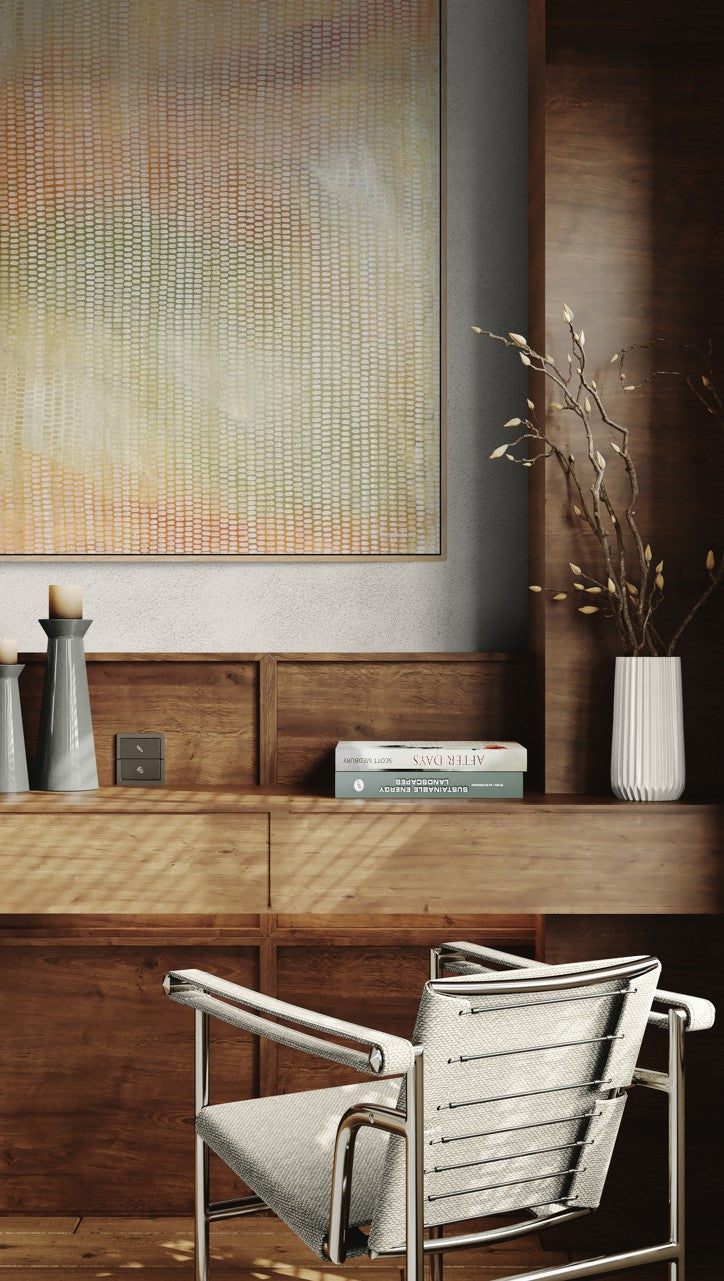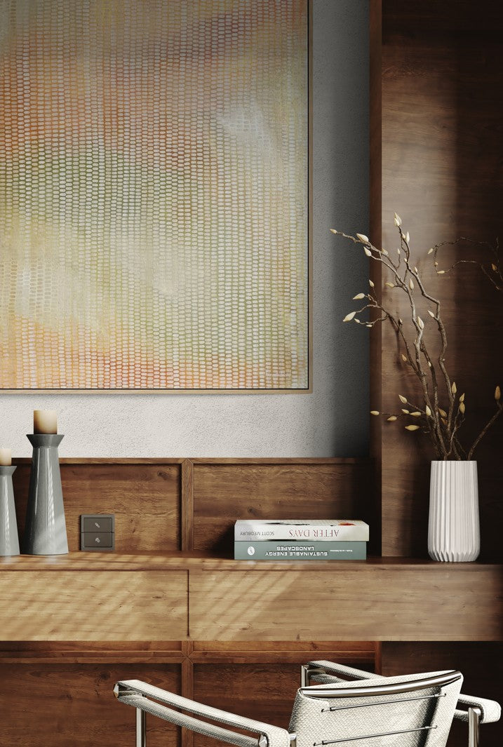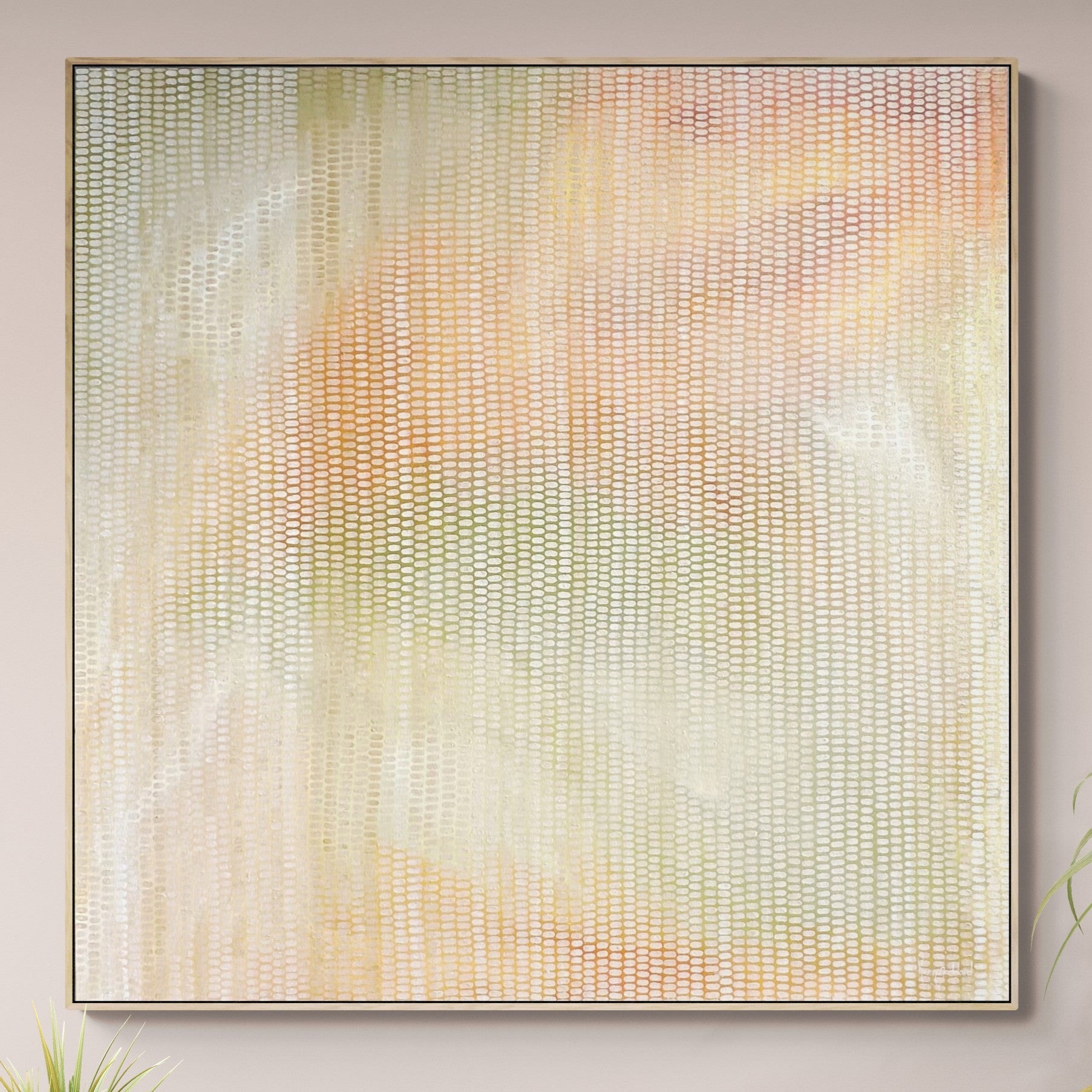 A celebration of colour, and nature, this original work is part of my series of mark making works, taking abstract scenes from nature creating a veneer of mark making obscuring the layers below. An emotive work, with a meditative quality. The colours are pastels and muted tones of ochre, all inspired by the sunrise. This work has a warmth and is far more delightful in reality than in a photograph.
