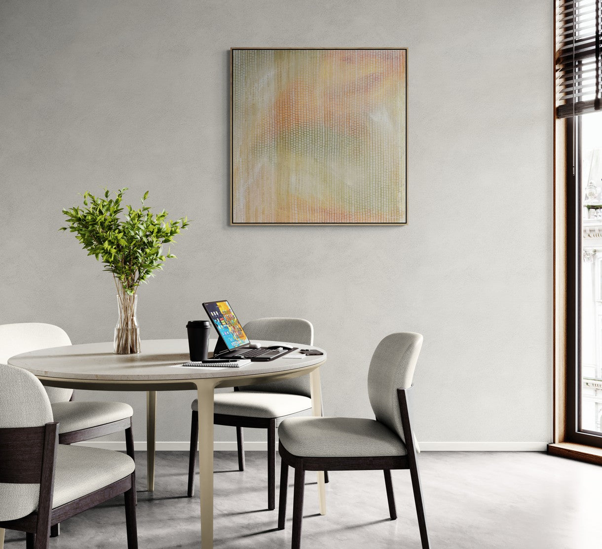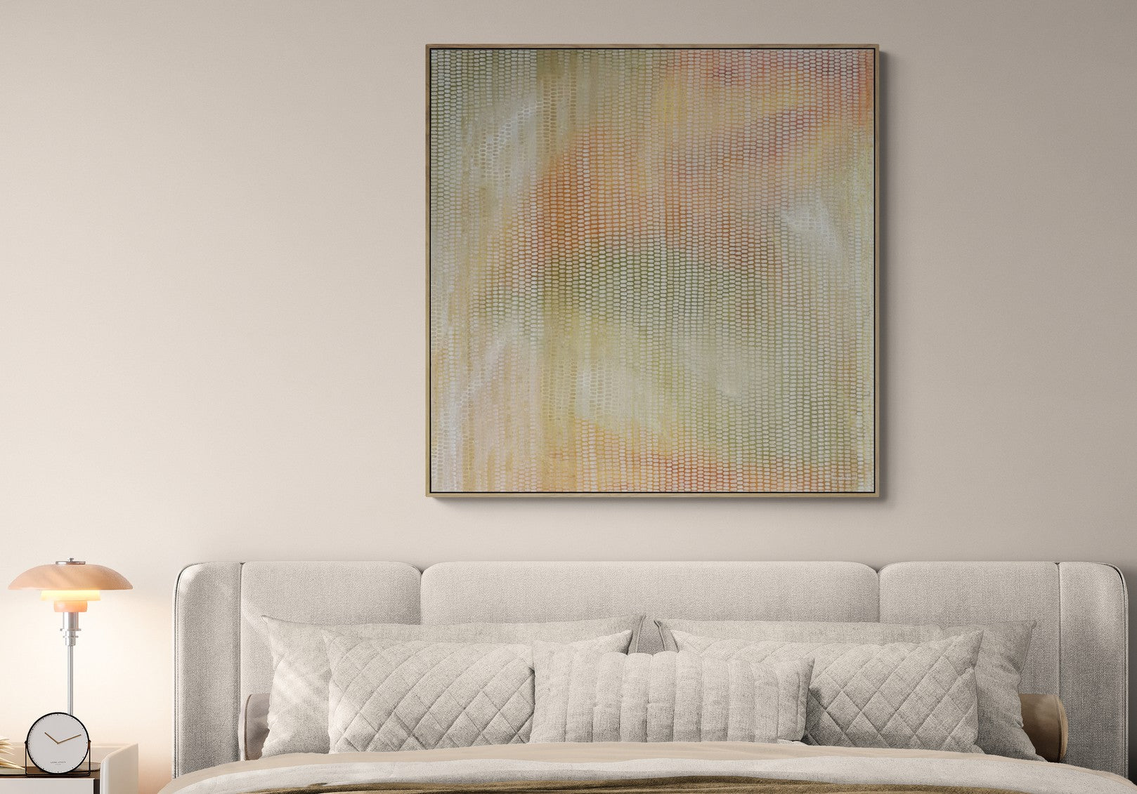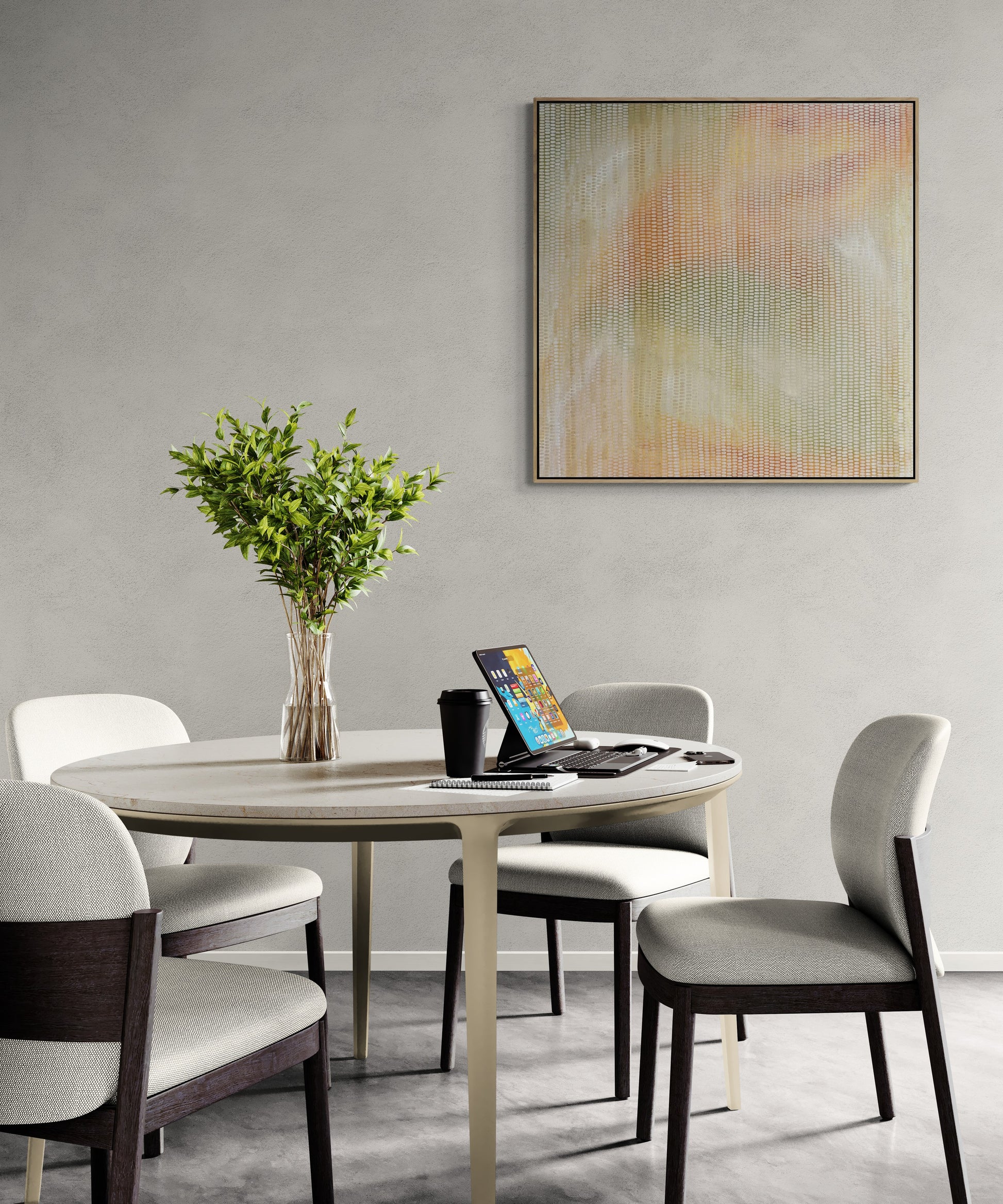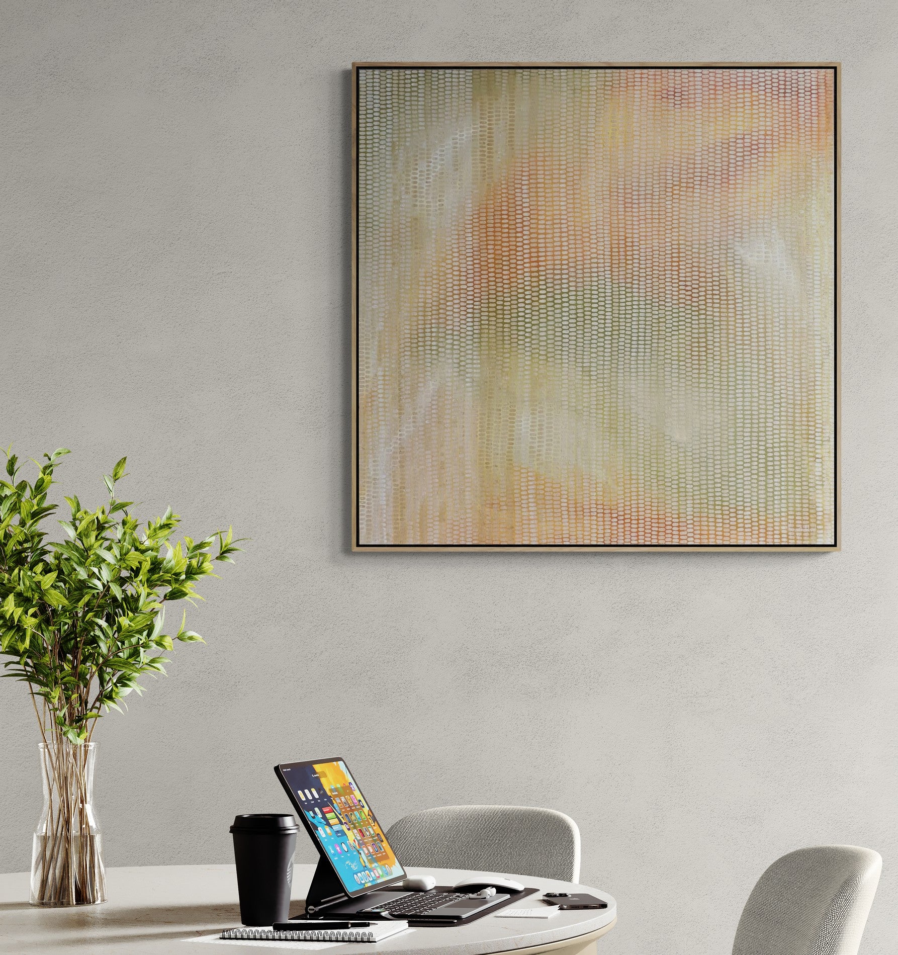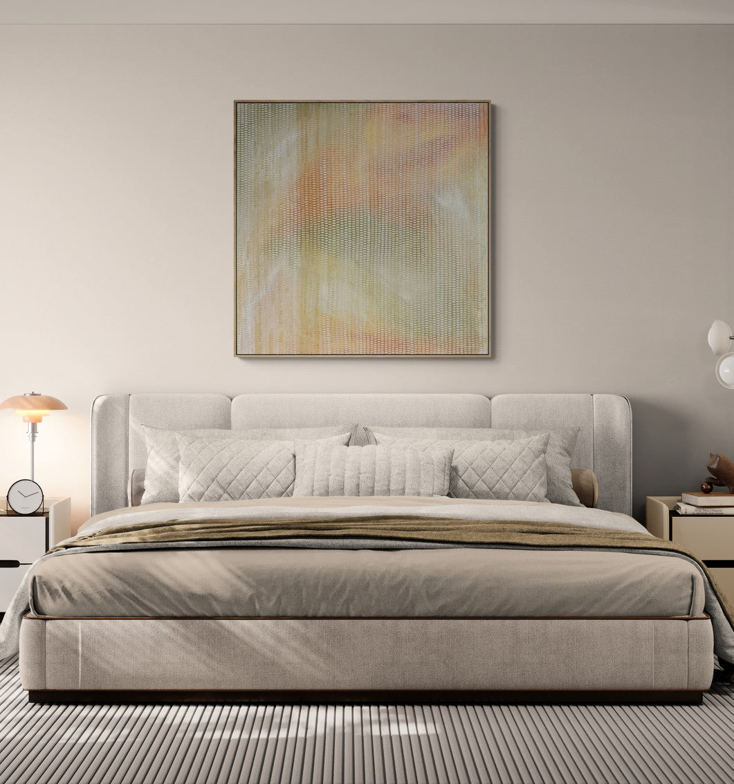 Acrylic on canvas. This one is a show stopper. A large enough scale to stand out in any home or office. The tones are soft but warm, and the composition is calming and ethereal.